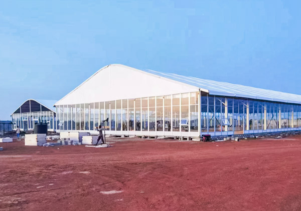 The tent uses a streamlined curved top shape, the roof cover is 850g white double coated PVC polyester which has a good fire retardant and anti-UV function; Surrounded by glass wall, not only the atmosphere beautiful, but also makes the light transmittance of the whole tent has been a good guarantee; Other supporting facilities inside the tent are also very complete, including lighting, floor, curtains, air conditioning equipment, stage, etc., for the grand wedding is fully prepared;